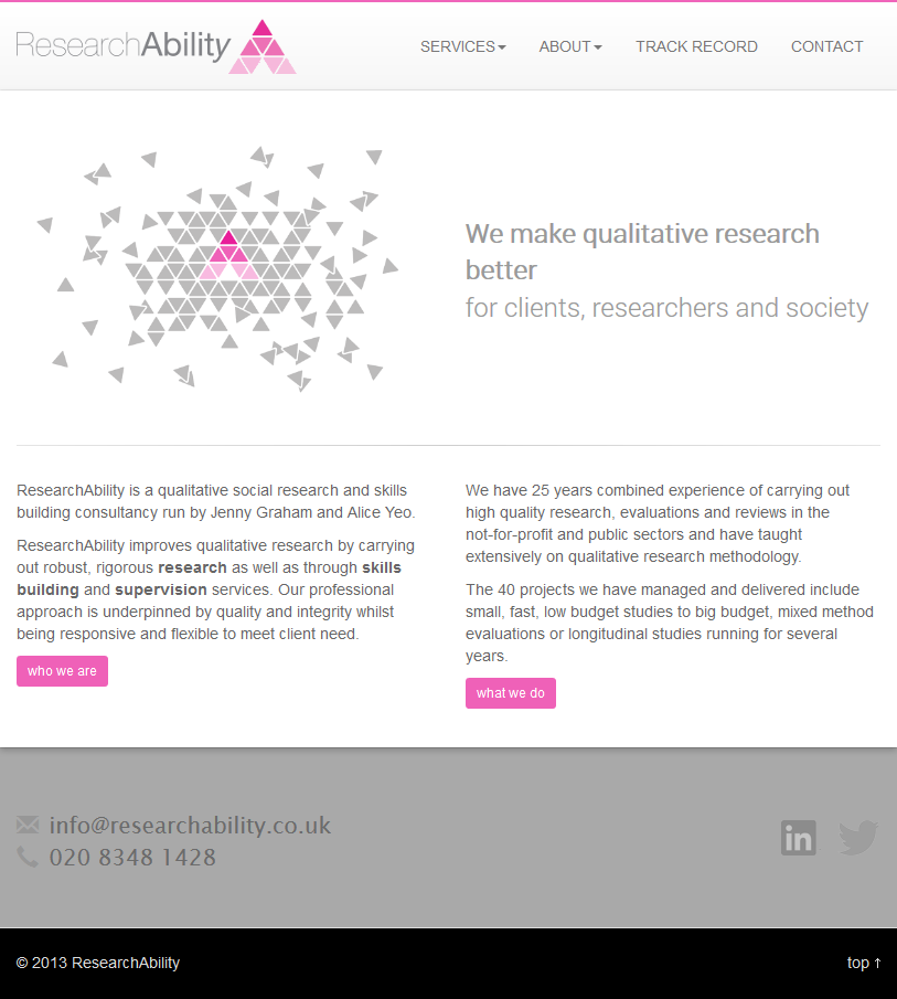 Research Ability is a qualitative research company based in London and were just starting out. We consulted with the client on brand, and referred them to the terrific designer Paul Warrington from The Cutting Room. We then took the graphics and built the site, working closely with the client to keep brand synergy.